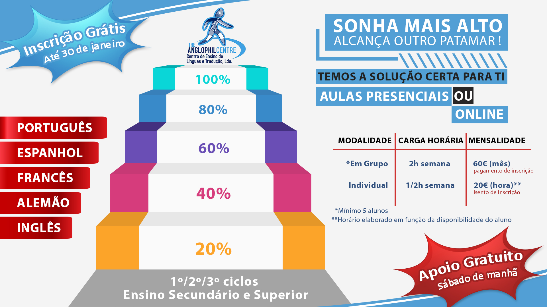 No âmbito do protocolo vigente entre o The Anglophil Centre e o Agrupamento publica-se o folheto, alusivo aos cursos anuais.