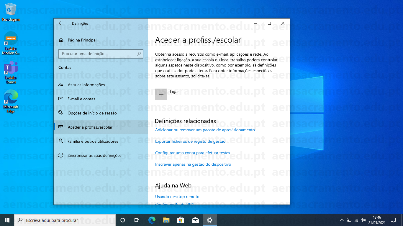 Na barra lateral esquerda selecionar a opção “Aceder a profiss./escolar”. De seguida selecionar a opção “Ligar”. Quando pedido, introduzir o seu email institucional e respetiva palavra-passe.