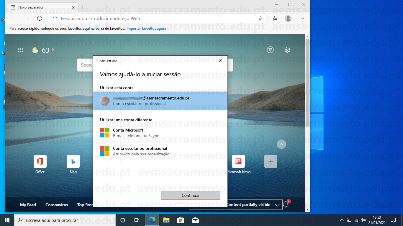 Será mostrada uma janela de ajuda ao inicio de sessão onde já consta a sua conta institucional. Selecione a sua conta e faça “Continuar”.