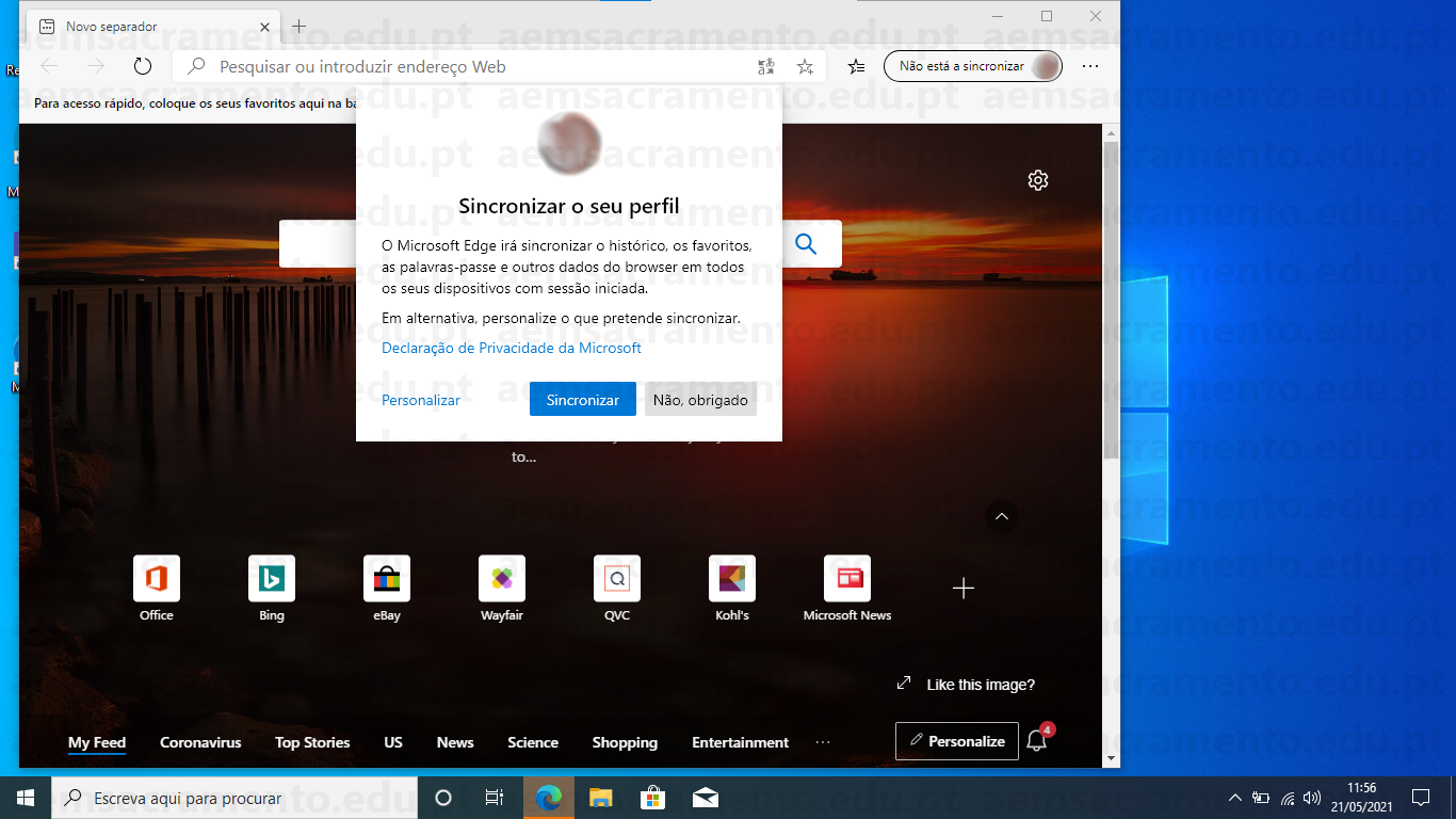 Será mostrada uma pequena janela para a ativação da sincronização do perfil. Selecionar “Sincronizar”. Este passo é muito importante para que haja uma ligação completa do Browser à sua conta Microsoft 365.
