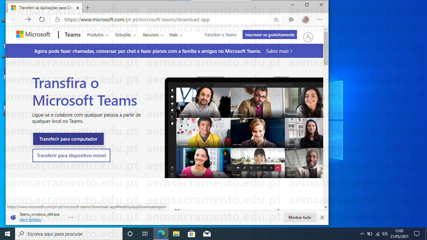 Aceder ao ícone que está no ambiente de trabalho “Instalar Teams”, irá ser aberto o browser Microsoft EDGE e mostrada uma página de onde poderá Transferir o Teams. De seguida abra o ficheiro e siga o assistente de instalação. Caso tenha seguido todos os pontos deste guia o Teams será instalado e aberto na sua conta sem mais intervenção.