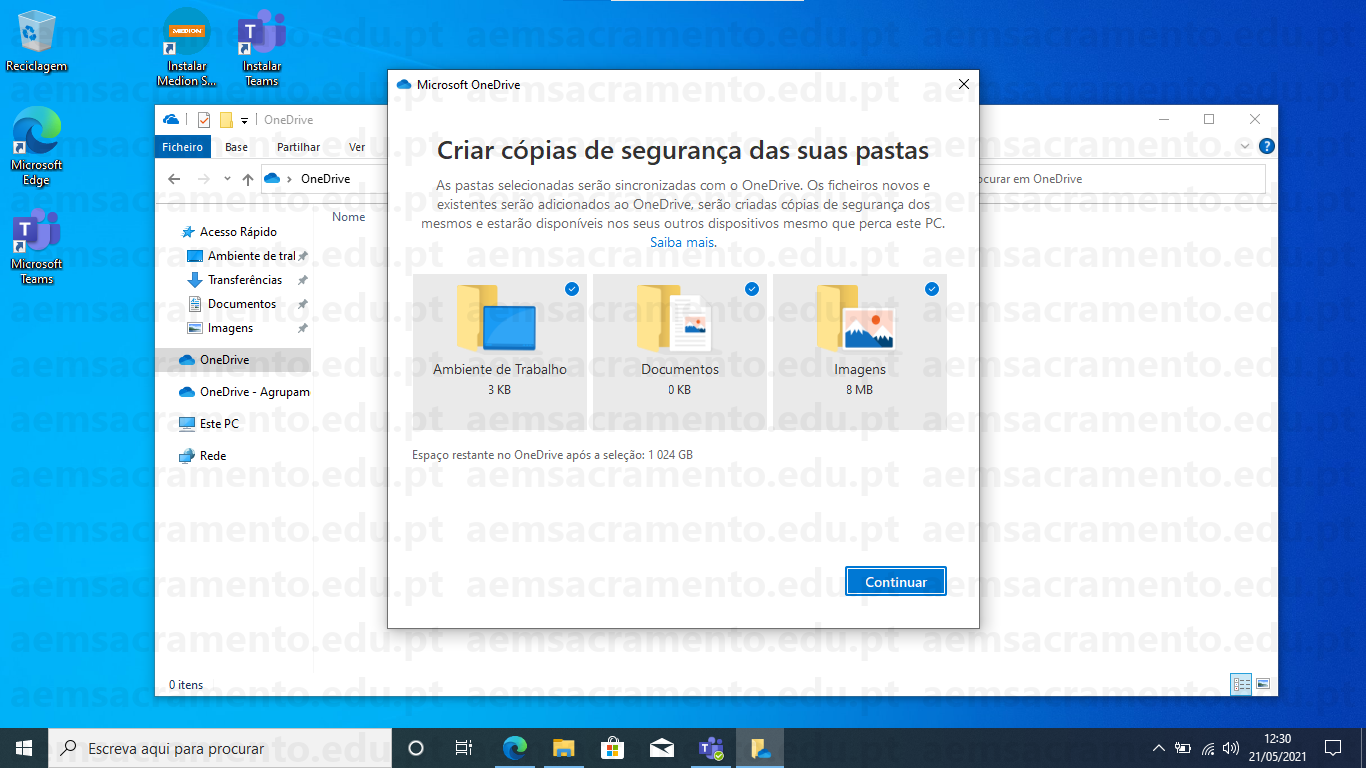 O Agrupamento recomenda que todas as pastas do utilizador sejam sincronizadas com o OneDrive.