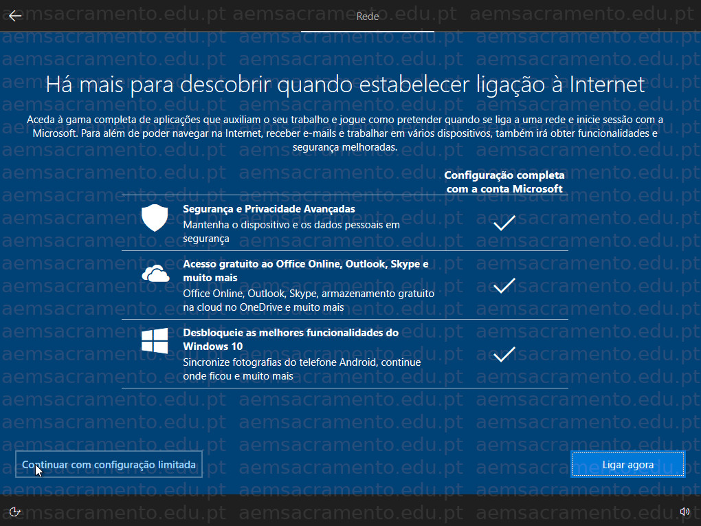 Selecionar “Continuar com configuração limitada”. O computador deve reiniciar e poderá voltar a pedir a configuração de rede. Neste caso proceder novamente como neste ponto (2).